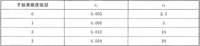 l--平板對角線的公稱長度(修約到100),mm; c?、c?-與平板準確度級別有關(guān)的系數(shù),見表A.1。注: